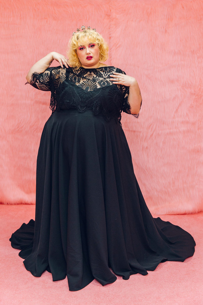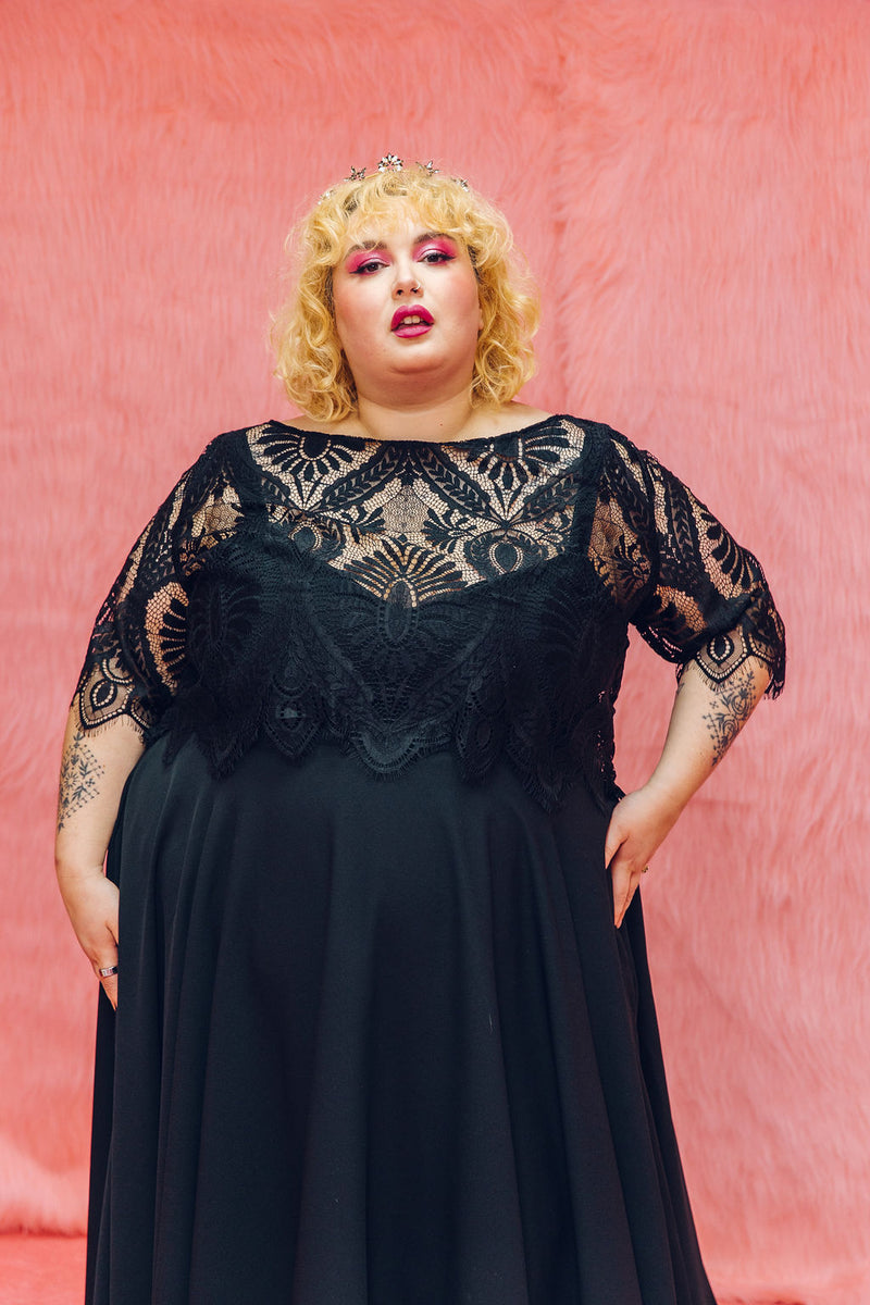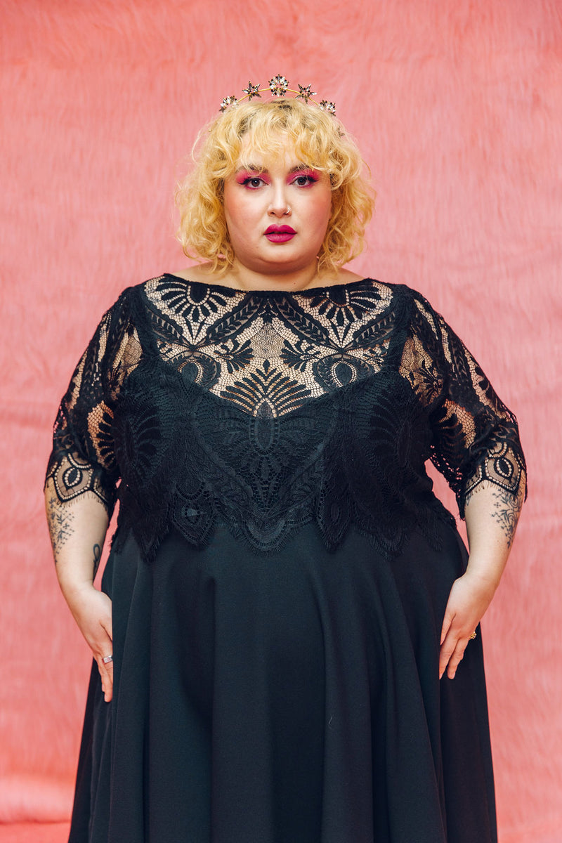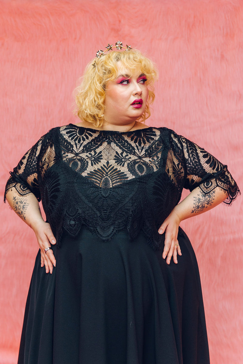 The Mabel top is made from the same lace as our Mabel dress, but this time can be styled with Maya our Black pulp Fiction dress or our reverse dip dye dress Psycho! It features 3/4 length sleeves with a scallop hem, a boat neck and beautiful buttons all the way up the back.