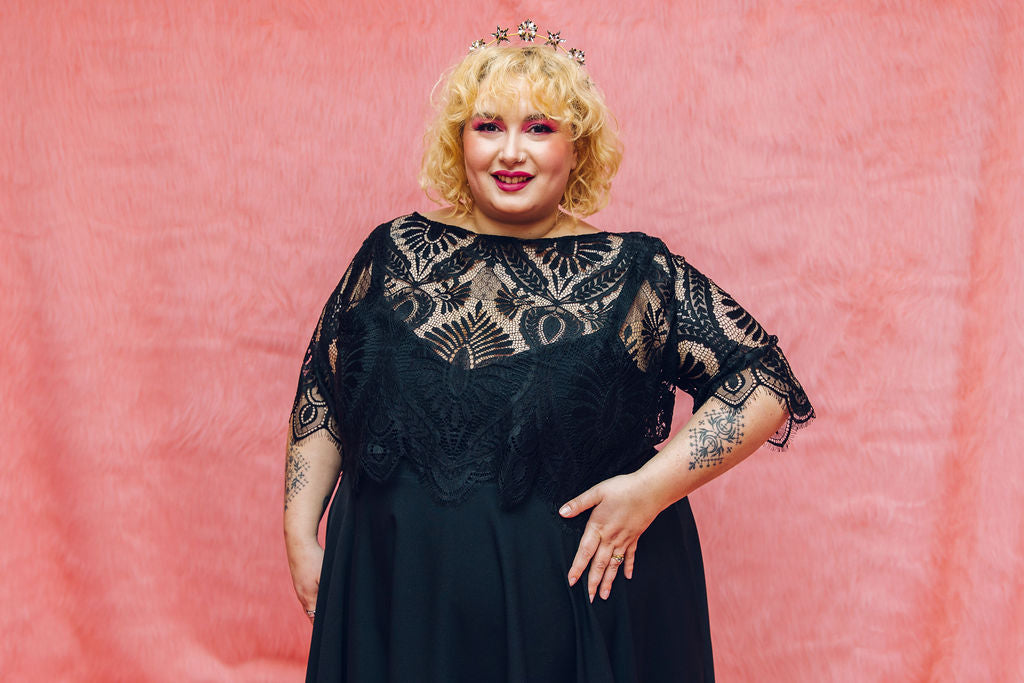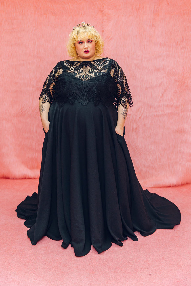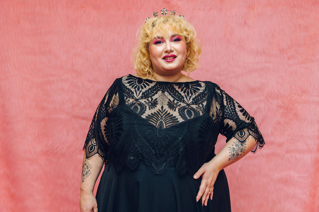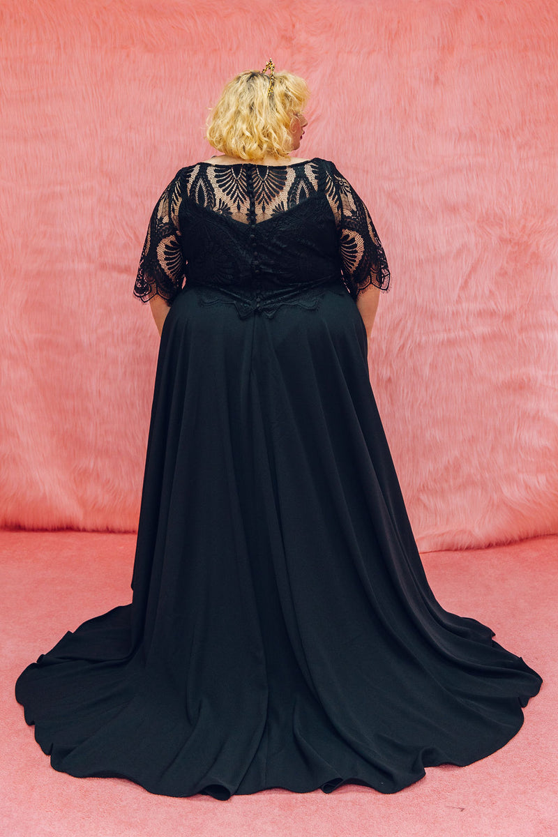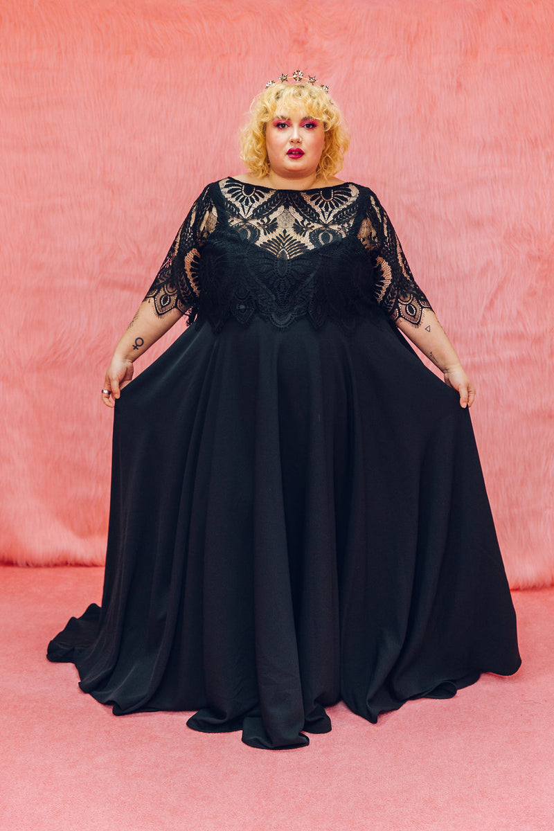 The Mabel top is made from the same lace as our Mabel dress, but this time can be styled with Maya our Black pulp Fiction dress or our reverse dip dye dress Psycho! It features 3/4 length sleeves with a scallop hem, a boat neck and beautiful buttons all the way up the back.